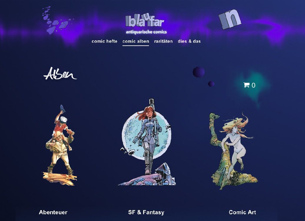 In der Kategorie »Alben« stellen frankobelgische Comics den Schwerpunkt, und hier die Genres Science Fiction & Fantasy, Abenteuer und Comic Art (mit den Großmeistern der Szene). In der Kategorie »Hefte« liegt das Augenmerk auf SF- und Superhelden-Comics, zum einen aus der Williams/Ehapa-Ära (1970er, 1980er), zum anderen aus der Phase der neuen Superhelden (Splitter, Dino, Panini ab den 1990ern). Fun-Comics à la Micky Maus oder Gaston bietet blaufarn, wenn überhaupt, nur vereinzelt unter »dies & das«.
